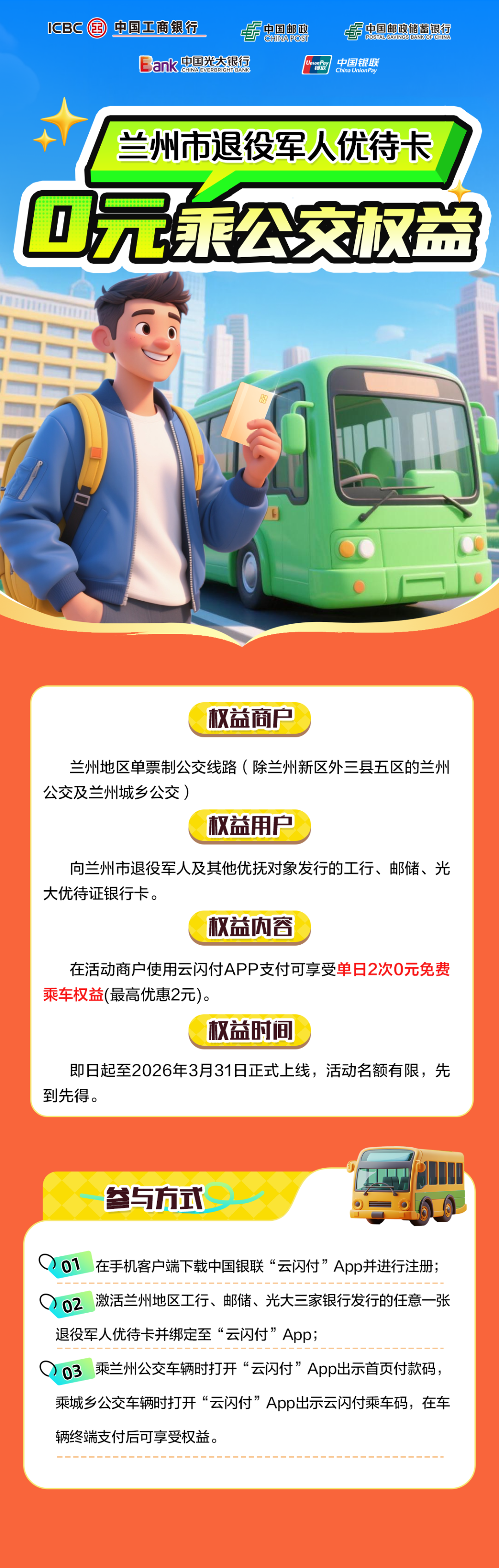 据悉,该活动由中国银联甘肃分公司联合工商银行、邮储银行、光大银行共同推出。凡持有上述三家银行发放的退役军人优待卡的用户,在兰州市公交集团运营的2元单票制线路上,即可享受这一福利。免费乘坐范围覆盖兰州公交集团及兰州城乡公交运营的市区内(含永登、皋兰、榆中三县及城关等五区)2元单票制线路,是兰州市拓展社会化拥军优抚工作的新举措。