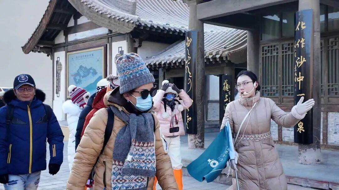 清晨的鸣沙山在朝阳下泛起金色波纹,虽然正值寒冬,但晴好的天气让游客能舒适地漫步沙海。月牙泉如一块温润的翡翠镶嵌在沙漠之中,清澈见底,微风拂过,泉水与沙山仿佛在低语,让许多游客驻足良久,不愿离去。